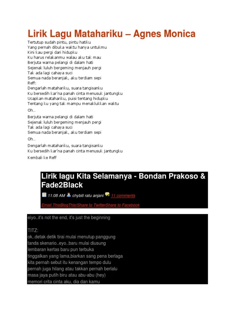 Layanan mobile dari situs entertainment terbesar indonesia, kapanlagi.com. Tertutup sudah pintu, pintu hatiku yang pernah dibuka waktu hanya untukmu kini kau pergi d. English translation of lyrics for matahariku by agnes monica. Putus asa kini di hidupku. | smule social singing karaoke app. Simbol natural dalam lirik lagu "di manakah matahariku" karya ebid g ade sebagai sarana kreatif penciptaan kosakata baru. Download download lirik lagu agnes monica sebuah rasa mp3 for free, fast and easy ~ download lirik lagu. Bahkan doa seakan tiada arti lagi Kegagalan datang dan datang lagi. Inilah chord gitar dan lirik lagu berjudul 'matahariku' yang dipopulerkan oleh agnes monica.